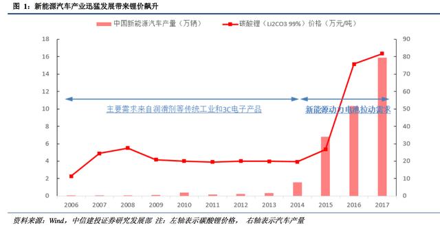 我国新能源汽车年产量自2014年的不足10万辆猛增至2017年的近80万辆,在锂资源供给偏刚性的大背景下,来自新能源汽车产业的需求驱动行业供需格局不断趋紧,促使近年来锂价出现飙升。百度搜索“乐晴智库”,获得更多行业深度研究报告