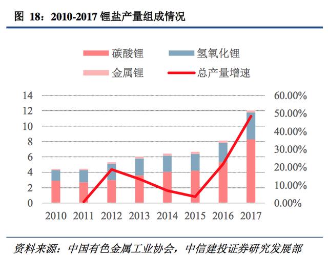 2017年,全球锂盐产量为23.54万吨(碳酸锂当量),同比增长21.5%,其中国内产量为12.34万吨,同比增长43.5%,占全球锂盐产量的52.42%。