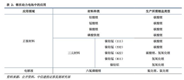 动力电池中的正极材料产生对锂的最主要需求。目前锂电池正极材料主要有磷酸铁锂、锰酸锂和三元材料三种类型,其中三元正极材料因为结合了其他两类正极材料的优点,具有能量密度高,循环寿命长等特点,是未来正极材料发展的趋势。