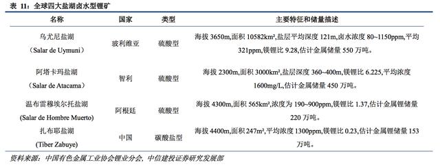 全球最为著名的四个特大型盐湖卤水型锂矿为玻利维亚的乌尤尼盐湖、智利的阿塔卡玛盐湖、阿根廷的温布雷穆埃尔托盐湖、中国的扎布耶盐湖。其中乌尤尼盐湖和阿塔卡玛盐湖集中了世界70%以上的储量基础。