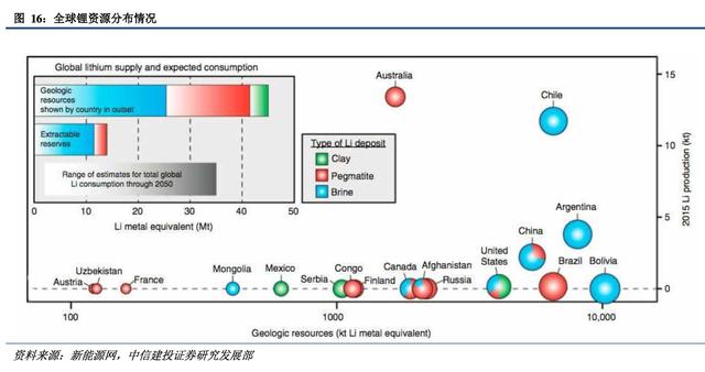 2017年全球已查明锂矿资源总量达4000万吨,南美“锂三角”地区(智利、阿根廷和玻利维亚交界处的高海拔湖泊和盐沼)所拥有的资源量之和占全球资源总量50%以上,另外中国、澳大利亚、葡萄牙、巴西、美国、津巴布韦等国家也有一定储量。