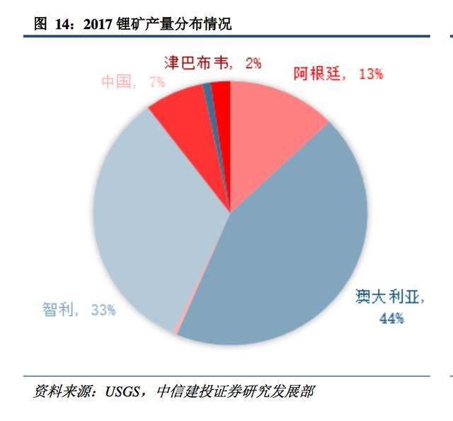 世界锂矿生产国有澳大利亚、智利、阿根廷、中国,其产量之和占世界锂矿产量的90%以上。根据美国地质调查局(USGS)统计,2016年全球锂矿金属产量为3.8万吨,折合碳酸锂当量约20万吨。其中,锂矿产量高度集中,澳大利亚占44%(9.88万9吨);智利占33%(7.45万吨);阿根廷占13%(2.91万吨)。