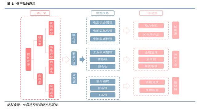 在全球范围内看,目前锂的下游应用主要集中在动力电池、传统工业和3C电子等领域,特别是伴随电动新能源汽车产业的高速发展,近年来对锂资源的需求快速提升。从产业链角度来看,锂资源产业链大致可分为上游开采、中游提炼、下游消费三个环节: