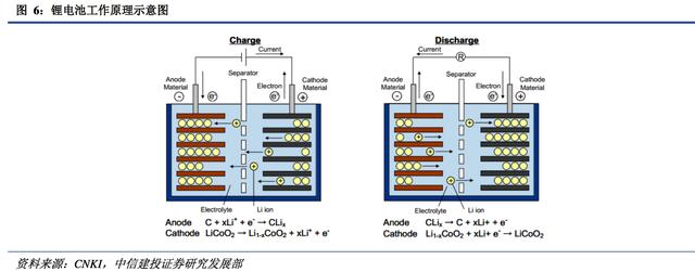 锂电池通常由电极、隔膜、电解液三部分组成。由于相对于其他种类电池,锂电池具有蓄电量大、无记忆、可充放次数多、质量轻、可回收、污染小等优点,因此成为新能源汽车动力电池的主要选择。锂电池的基本工作原理如图所示,在放电过程中,锂离子从正极经过隔膜进入负极,同时释放电子,电子在外部电路中运动产生了电流;充电过程中电池中发生的化学反应与放电过程相反。