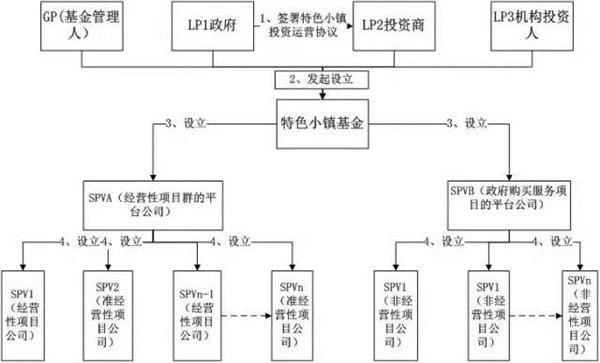 要考虑适合特色小镇基金的具体运作路径,首先要在特色小镇整体项目的基础上,按照单体项目是否有经营现金流进行划分,由基金针对经营性项目(包括准经营性项目)及非经营性项目,分别设立SPV平台公司及具体SPV项目公司进行运作。特色小镇基金的运作一般按照下述模式进行: