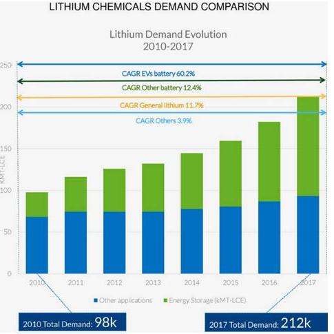 虽然目前锂业务不是公司最大收入来源,但是为公司最大的利润来源,贡献超过一半的公司利润。而且,未来全球锂资源需求将持续上涨:2010年全球锂资源需求量为9.8万吨,而到了2017年则迅速增长为21.2万吨,预计2018年还将增长20%。