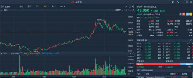 SQM智利矿业化工,全球锂矿龙头企业之一,是全球重要的锂矿资源开发者,是美股市场里著名的锂电池概念股,受到新能源汽车行业的发展,市场对于锂电池的需求日益提高,公司受益行业发展,从2017年以来股价涨幅达到65.77%。