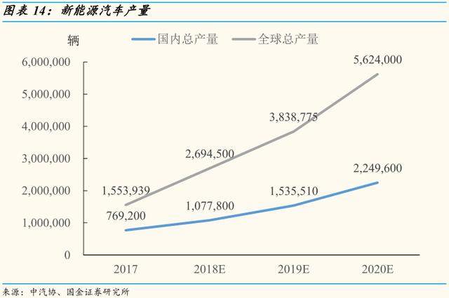 根据中汽协数据,2017年中国新能源汽车产量达到74.5万辆,约占世界总产量5成。我们预计未来3年内新能源汽车的产量将会保持年均约40%左右的增速,2020年中国产量达到229万辆。假设我国新能源汽车产量未来3年占全球总产量比例维持在40%左右,那么2020年全球新能源汽车产量将会达到573万辆。