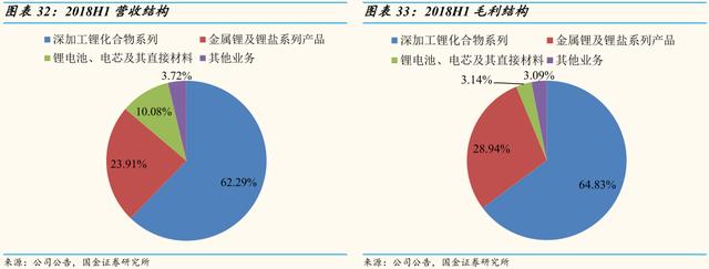 2018年上半年深加工锂化合物系列产品和金属锂及锂盐产品分别贡献营业收入14.52亿元和5.58亿元,分别占总营收的62.29%和23.91%,分别占毛利的64.83%和28.94%。