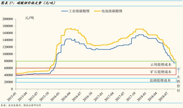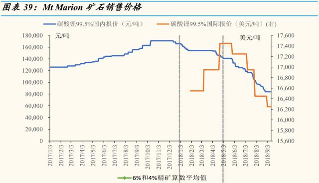 Marion锂精矿销售价格2017H1、2017H2、2018H1分别为565、674、752美元/干吨(不含税)。锂精矿售价主要锚定海外碳酸锂和氢氧化锂价格,随着海外碳酸锂和氢氧化锂价格的回落,以及参考部分海外精矿售价,我们预计,由于海外碳酸锂价格走势相较于国内有一定滞后,随着碳酸锂国际报价的走低,2019年锂精矿售价或逐步下降至650美元/干吨(不含税)左右。