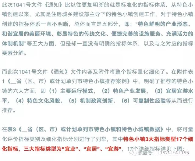 此次1041号文件《通知》另一个亮点就是明确了典型特色小镇和特色小城镇的条件,以往的特色小镇创建中,特色小镇和特色小城镇的标准是模糊的,没有明确的进行界定。此前住房城乡建设部《关于开展特色小镇培育工作的通知》并未对特色小镇的条件、范围、大小进行界定,直至国家发改委2016年12月《国家发展改革委关于加快美丽特色小(城)镇建设的指导意见》发改规划〔2016〕2125号提出:“以镇区常住人口5万以上的特大镇、镇区常住人口3万以上的专业特色镇为重点,兼顾多类型多形态的特色小镇,因地制宜建设美丽特色小(城)镇。” 四部委联合印发的《关于规范推进特色小镇和特色小城镇建设的若干意见》(发改规划〔2017〕2084号中明确特色小镇“规划用地面积控制在3平方公里左右,其中建设用地面积控制在1平方公里左右,旅游、体育和农业类特色小镇可适当放宽”,但仍未区分特色小镇与特色小城镇,本次1041号文件,明确了特色小镇、特色小城镇的基本条件,这是又一大亮点。