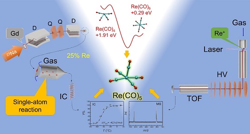科研人员在日本理化学研究所利用RIKEN的直线加速器RILAC提供的束流,通过natGd(23Na,xn)172-177Re反应生成了Re的短寿命同位素,冲出靶表面的反应产物经由充气谱仪GARIS进行物理预分离,使重离子束流及部分副反应产物进行大角度偏转,并将目标产物引导至充有反应气体的传输室内。经过与反应气体CO的配位反应,生成的易挥发物质被载气传输至气相等温色谱中进行吸附焓等相关性质的测定。另外,科研人员在近代物理所改造了一套适用于研究羰基配合物的激光灼烧飞行时间质谱装置。利用激光灼烧Re金属靶,用含有CO的高压气体对产生的等离子体进行冷却,在此过程中,部分Re带电离子与CO反应,经过一段延长管区域,经过充分反应的最终产物进入高压电场区域进行质量测量。通过该装置成功鉴别了单原子量级的金属原子在该气相条件下的最终产物:18电子的羰基配离子[Re(CO)6]+,17电子羰基配离子[Os(CO)5]+和[W(CO)5]-配离子,并证实了它们的等电子体——17电子的中性Re(CO)5配合物作为最终产物可以在惰性气氛中稳定存在。