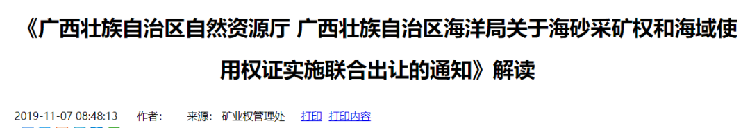 根据《关于加强海砂管理的通知》(国土资发〔2007〕190号)、《海域使用权管理规定》(国海发〔2006〕27号)等规定,除特殊情况外,海砂采矿权和海域使用权的出让均应采取招拍挂市场化方式,“两权”分开出让因可能产生不同主体而导致实际难以操作。2019年3月我区对广西钦州市三墩海域B矿区回填用海砂采矿权和海域使用权进行了联合出让试点,效果较好。为进一步加强广西海域海砂开采秩序和行业管理,参考钦州市海砂采矿权和海域使用权联合出让成功经验,根据《矿产资源开采登记管理办法》(国务院令第241号)、《海域使用权管理规定》(国海发〔2006〕27号)、《关于加强海砂管理的通知》(国土资发〔2007〕190号)等采矿权和海域使用权管理有关规定,自治区自然资源厅和自治区海洋局联合印发了《广西壮族自治区自然资源厅广西壮族自治区海洋局关于海砂采矿权和海域使用权证实施联合出让的通知》。