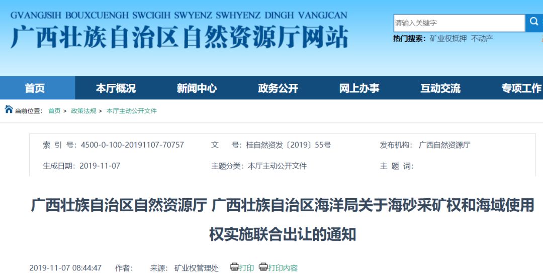 近日,广西壮族自治区自然资源厅与海洋局决定将海砂采矿权和海域使用权实施联合出让。根据此前现行法规,海砂采矿权和海域使用权的出让均应采取招拍挂市场化方式,“两权”分开出让因可能产生不同主体而导致实际难以操作。2019年3月,广西对钦州市三墩海域B矿区回填用海砂采矿权和海域使用权进行了联合出让试点,9月21日,5.2万吨海砂从北部湾港钦州港区启航驶往香港,试点 效果较好,广西决定进行推广。新规规定,采取招标拍卖挂牌出让方式的,“两权”招拍挂合并进行,不再单独进行海砂采矿权或海域使用权的出让。属于协议等其它方式出让的,可进行联合报批。