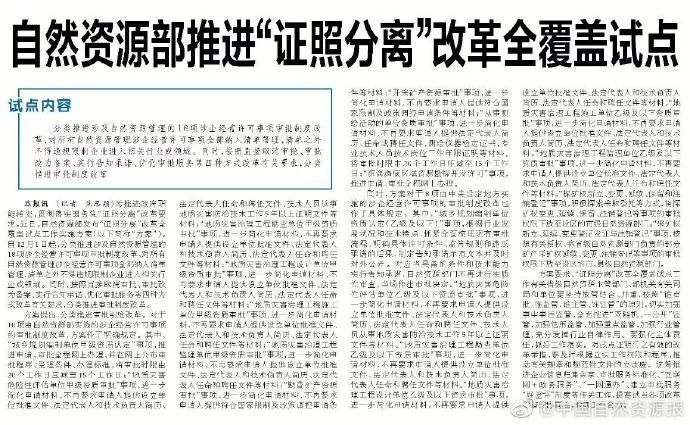 方案提出,分类推进审批制度改革。对于10项由自然资源部实施的涉企经营许可事项的审批制度改革,方案作了明确规定。其中,“城乡规划编制单位甲级资质认定”事项,推进申请、审批全程网上办理,并在网上公布审批程序、受理条件、办理标准,将审批时限由20个工作日压减至15个工作日;“地质灾害危险性评估单位甲级资质审批”事项,进一步简化申请材料,不再要求申请人提供设立单位批准文件、法定代表人和技术负责人简历、法定代表人任命和聘任文件、技术人员从事地质灾害防治技术工作5年以上证明文件等材料;“地质灾害治理工程勘查单位甲级资质审批”事项,进一步简化申请材料,不再要求申请人提供设立单位批准文件、法定代表人和技术负责人简历、法定代表人任命和聘任文件等材料;“地质灾害治理工程设计单位甲级资质审批”事项,进一步简化申请材料,不再要求申请人提供设立单位批准文件、法定代表人和技术负责人简历、法定代表人任命和聘任文件等材料;“地质灾害治理工程施工单位甲级资质审批”事项,进一步简化申请材料,不再要求申请人提供设立单位批准文件、法定代表人和技术负责人简历、法定代表人任命和聘任文件等材料;“地质灾害治理工程监理单位甲级资质审批”事项,进一步简化申请材料,不再要求申请人提供设立单位批准文件、法定代表人和技术负责人简历、法定代表人任命和聘任文件等材料;“勘查矿产资源审批”事项,进一步简化申请材料,不再要求申请人提供符合国家限制及政策调控申请条件等材料;“开采矿产资源审批”事项,进一步简化申请材料,不再要求申请人提供符合国家限制及政策调控申请条件等材料;“从事测绘活动的单位资质审批”事项,进一步简化申请材料,不再要求申请人提供法定代表人简历、任命或聘任文件,测绘仪器检定证书,专业技术人员技术岗位工作年限证明等材料,将审批时限由20个工作日压减至15个工作日;“深海海底区域资源勘探开发许可”事项,推进申请、审批全程网上办理。