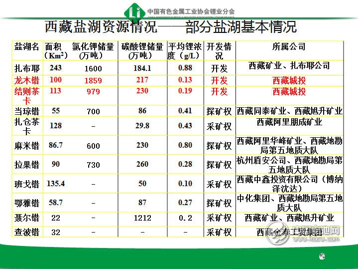 其中,扎布耶盐湖在西藏日喀则地区仲巴县境内,湖面海拔4221m,湖区面积243km2,碳酸锂储量184万吨,是著名的低Mg/Li比碳酸型盐湖。西藏矿业 采用“冷冻除碱硝-梯度太阳池升温析锂”生产碳酸锂,目前产量为6000t/y。