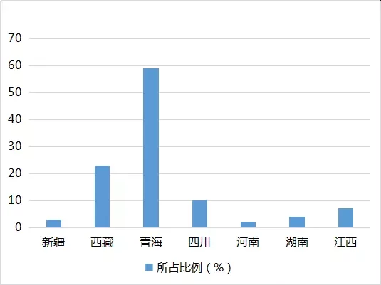 锂矿床分布十分集中,盐湖卤水型锂矿床主要分布在青藏高原和湖北;四川、江西、湖南、新疆四省的矿石锂资源占到全国矿石锂资源的98.8%;