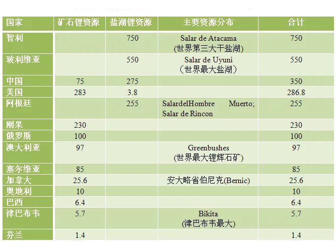 智利的阿塔卡马(SalardeAtacama)、玻利维亚的乌尤尼(SalardeUyuni)、阿根廷的翁布雷穆尔托、美国的银峰、中国西藏扎布耶和青海盐湖等为目前全球已探明的锂资源含量丰富的盐湖。