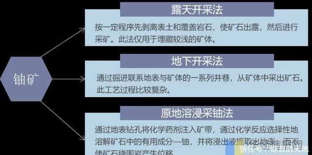 铀矿开采方法主要有露天开采、地下开采和原地浸出采铀三种方法。原地溶浸采铀法(ISL或ISR)采矿在总产量中的份额一直在稳步增加,主要是由于哈萨克斯坦,2018年占总产量的一半以上。