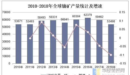 铀矿资源是重要的能源矿产和战略资源,其重要性不言而喻。但铀矿资源在世界上的分布极不平衡,主要集中于澳大利亚、哈萨克斯坦、加拿大、俄罗斯、南非、尼日尔、巴西、中国、纳米比亚和乌克兰等10国,这10国的铀资源储量约占世界铀资源储量的87%。数据显示,2018年全球铀矿产量达53498吨,同比下降10%。