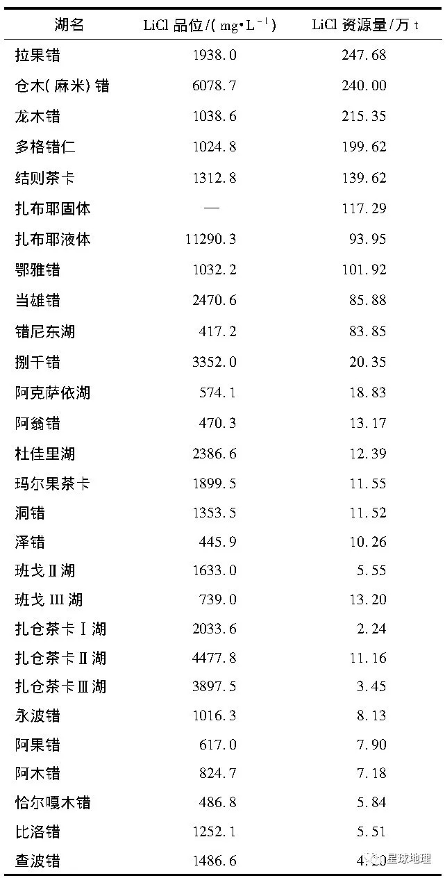 表2 西藏主要盐湖锂资源品位及储量