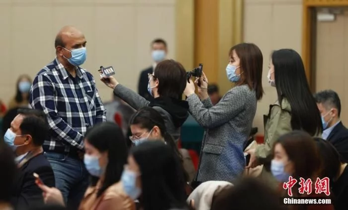 3月3日,全国政协十三届四次会议新闻发布会在北京举行。图为一名巴基斯坦记者在发布会开始前,在设在北京梅地亚中心多功能厅的分会场内接受采访。 中新社记者 杜洋 摄