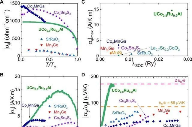 极其反常的能斯特电导率,表明铀和锕系合金在材料拓补与强电子相关性研究方面很有前途。随着理解和调节的深入,我们有望在未来某一天成功利用其中的一些出色反应。