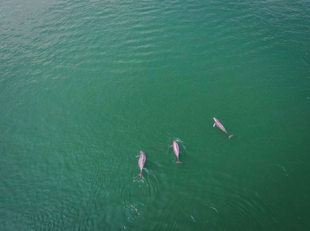 这是2021年5月11日在湖北省宜昌市拍摄的在水中嬉戏的长江江豚(无人机照片)。新华社记者 肖艺九 摄