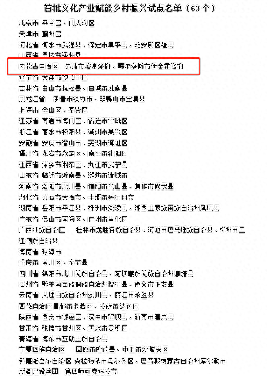 9月11日,记者从内蒙古自治区文化和旅游厅了解到,赤峰市喀喇沁旗与鄂尔多斯市伊金霍洛旗入围全国首批文化产业赋能乡村振兴试点名单,成为内蒙古的代表。