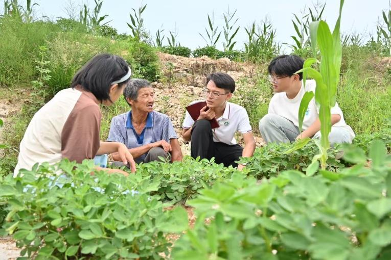 连日阴雨导致部分花生出现叶黄根萎现象,队员们结合课堂所学的病虫害防治知识初步判断病因,并立即视频连线学院刘兆新老师,通过实时拍摄病株细节请求远程诊断。会诊结束后,他们迅速组织村民进行田间排水,并提出喷施叶面肥等科学补救措施,反应及时、处置得当。
