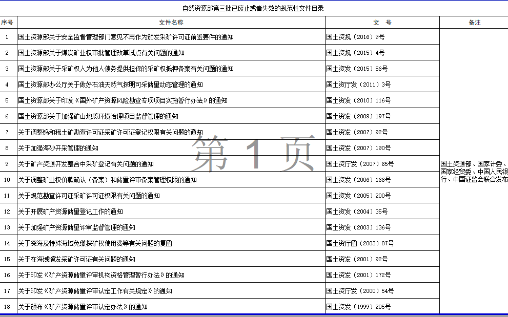 为贯彻落实党中央、国务院关于矿业权出让制度改革等有关要求,深入推进《自然资源部关于推进矿产资源管理改革若干事项的意见(试行)》(自然资规〔2019〕7号)实施,自然资源部开展了矿产资源管理规范性文件集中清理工作。现将自然资源部第三批已废止或者失效的规范性文件目录予以公布。