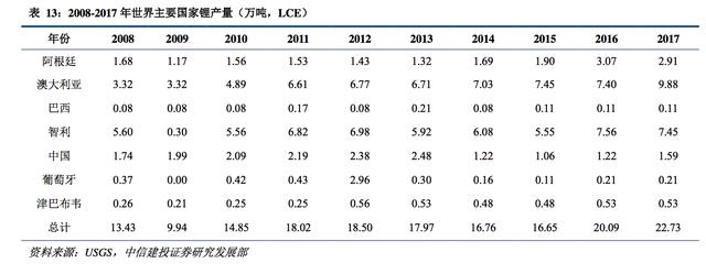2008至2012年间,除2009年因金融危机影响产量下降之外,全球锂矿产品产量(折合碳酸锂当量计算)呈现逐年上升趋势,2012年达到18.5万吨高峰。