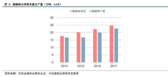 近年来,由于新能源汽车产业的拉动作用,全球锂盐需求持续快速增长,整体呈现供不应求状态。根据相关数据,2014年全球碳酸锂需求量为17.6万吨,产量为16.65万吨;2017年碳酸锂需求量为24.7万吨,产量为22.73万吨,需求端复合年增长率为12.0%,供给端复合年增长率10.9%,近三年碳酸锂的需求缺口分别为3.4万吨,2.2万吨和1.97万吨,有逐渐缩小的趋势。