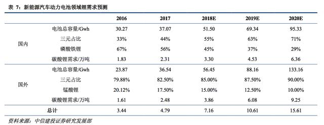 预计2018全球新能源汽车动力电池锂需求突破7万吨碳酸锂当量,到2020年将达到15万吨碳酸锂当量,年复合增长率为45.95%。预计国内对车用碳酸锂的需求占有全球的比例将持续领跑,到2020年将达到6.36万吨碳酸锂当量。