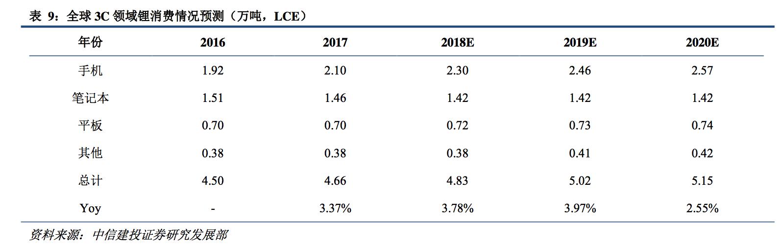 另外,各主要3C电子产品设备单位锂消费量有所提升,预计此后该指标仍将保持稳定缓慢增长。
