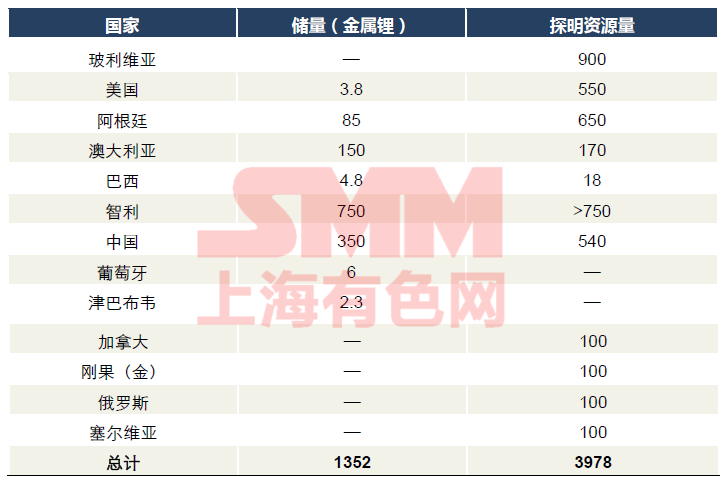 根据美国地质调查局公布的数据,世界锂资源储量(金属锂)总计为1,352万吨,探明资源量为3,978万吨。其中世界探明资源量排名前十一位为玻利维亚、智利、阿根廷、美国、中国、澳大利亚、加拿大、刚果(金)、俄罗斯、塞尔维亚和巴西。