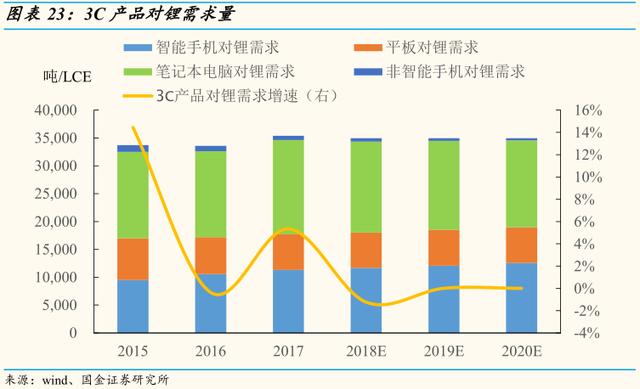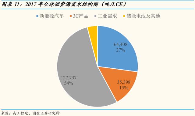 全球锂需求端主要应用在三个方面,工业需求、新能源汽车、3C产品,达到总需求的96%。其中,2017年54%锂资源应用于工业需求端,27%应用于新能源汽车,15%应用于3C产品,4%应用于储能电池及其他。