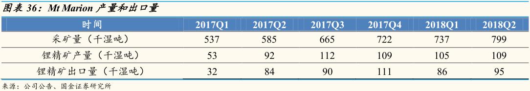 MtMarion为公司目前锂矿主要供应商。2017年Q2MtMarion已经具备40万吨/年的产能,截至2018年二季度,MtMarion每季度稳定的产出约10万吨(湿吨)锂精矿。根据公司与MtMarion的包销协议,2017-2019年,赣锋锂业将包销全部锂精矿,2019年之后至少包销49%的锂精矿。