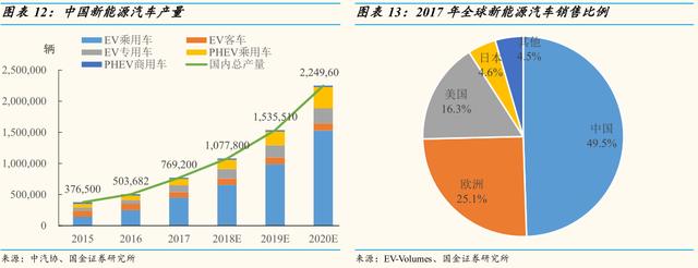 根据中汽协数据,2017年中国新能源汽车产量达到74.5万辆,约占世界总产量5成。我们预计未来3年内新能源汽车的产量将会保持年均约40%左右的增速,2020年中国产量达到229万辆。假设我国新能源汽车产量未来3年占全球总产量比例维持在40%左右,那么2020年全球新能源汽车产量将会达到573万辆。