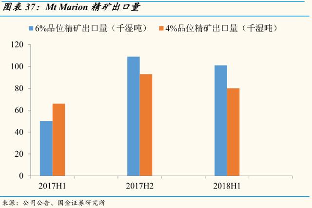 从MtMarion产出比例来看,高品位锂精矿占比在逐步提升。2018年上半年,公司合计出口18.1万湿吨的锂精矿,其中6%品位的锂精矿出口10.1万湿吨,4%品位的出口8万湿吨。2018年,MtMarion将提供40万吨的锂精矿,并持续提高品位为6%的锂精矿的比重,公司预计在2018年底前完成技改,将所有4%品位的锂精矿提升至6%品位。