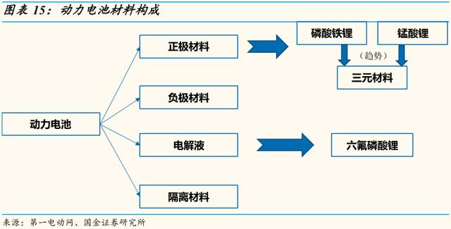 目前,市场上制造动力电池正极原材料主要为磷酸铁锂、三元材料、锰酸锂,而电解液原材料则需要用到六氟磷酸锂。新能源汽车的放量增长将极大的带动锂资源的需求。