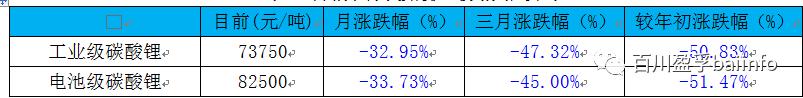 截至到目前,国内工业碳酸锂价格7.375万元/吨,较上月跌幅32.95%,较三月前跌幅47.32%,较年初跌幅50.83%;电池碳酸锂价格8.25万元/吨,较上月跌幅33.73%,较三月前跌幅45%,较年初跌幅51.47%。
