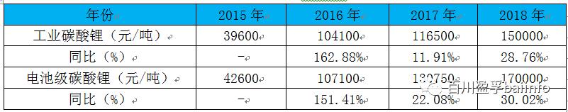 2017年的风光延续到了2018年年初,据百川资讯统计,2018年年初,工业碳酸锂市场价格涨至15万元/吨,较2017年年初的价11.65万元/吨,上涨了28.76%;电池级碳酸锂价格涨至17万元/吨,较2017年年初的13.075万元/吨的价格上涨了30%。