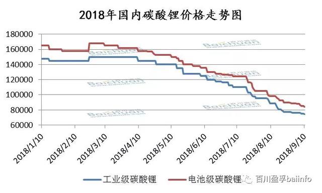 从去年到今年的年初,国内碳酸锂可谓分光无限,无论是工业级还是电池级碳酸锂,市场价格水平都是一飞冲天,但是好景不长,2018年4月份开始,随着国内盐湖锂产能的释放,整体市场供不应求的局面逐步得到缓解,加上中游材料以及电池方面对于上游锂盐的需求不强,另外国家补贴政策风向标的变化影响,以磷酸铁锂为主要需求端发生了明显的变化,综合作用下,碳酸锂市场成交量的萎缩,锂盐厂家的步步降价,部分小厂迫于资金周转降价出货等因素的影响,国内碳酸锂价格水平接连下滑,可以说是跌跌不休。
