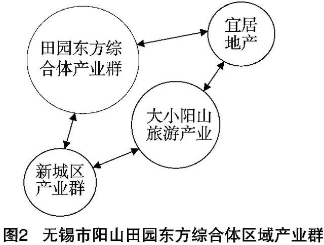 无锡市阳山田园东方综合体在资源获取与资源整合利用方面进行了成功实践, 说明无锡市阳山田园东方综合体的经营主体具有较强的能力。第一, 资源获取和挖掘能力。无锡市阳山镇有万亩桃林, 素有“中国水蜜桃之都”美誉, 且阳山镇拥有大小阳山的死火山风貌、优美的生态自然景观, 另外还有千年古刹禅宗寺、百年书院等人文建筑。资源禀赋给田园东方综合体的设计与建设带来了丰富的灵感。一方面, 在尊重自然、尊重历史、尊重生态的原则下, 对阳山镇本地生态自然景观和人文建筑在建筑形态、空间格局、原生植物等方面进行了最大程度的保护。对无法保护的自然资源进行改造和再利用。另一方面, 将现代新业态、新活动有机“植入”古建筑, 实现不同业态在空间上进行对接, 实现历史文化与现代文明相交融。除获取自然资源之外, 无锡市阳山田园东方综合体建设获得了地方政府的大力支持。第二, 区域产业融合能力。推进区域产业群建设, 实现区域核心产业、支撑产业、配套产业、衍生产业共生共荣是无锡市阳山田园东方综合体成功的关键。阳山镇拥有丰富的旅游产业, 建设有自然资源旅游产品和人文资源旅游产品。另外, 阳山镇的宜居宜业地产, 是田园综合体建设的重要补充。区域产业布局和产业空间聚集实现了田园生产、田园景观以及田园生活的有机结合 (图2) 。