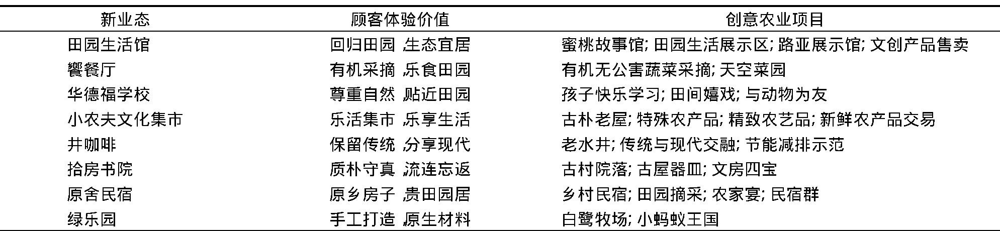 无锡市阳山田园东方综合体通过发展循环农业和创意农业, 提高顾客体验价值。在循环农业方面, 根据循环利用原理和物质再循环设计与应用技术将资源利用效益最大化。如阳山田园综合体建设过程中, 在对老旧倒塌的古屋进行修缮时, 对老瓦、青砖、枯木、石料等都进行了保存, 并再利用到修旧屋和重新设计的建筑中, 此类物件承载着历史和人们的记忆。在创意农业方面, 根据创意产业的思维有效地将科技和人文融入审美体验、农事体验, 实现提高顾客体验价值目的。如无锡市阳山田园东方综合体创新设计了8个新业态, 每个新业态都有个性化的顾客体验价值和创意农业项目 (表2) 。