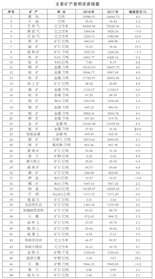 截至2017年底,我国已发现矿产173种,其中天然气水合物为新发现矿种。我国煤炭、石油、天然气、页岩气、锰矿、金矿、石墨等重要矿产查明资源储量增长,勘查新增资源量超过50亿吨煤田3处、超过百吨的金矿2个,探明地质储量超过亿吨的油田2处、超过500亿立方米的天然气田3个。