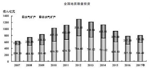 2017年,全国地质勘查投资782.85亿元,较上年增长1.0%,连续4年下降后首次回升。