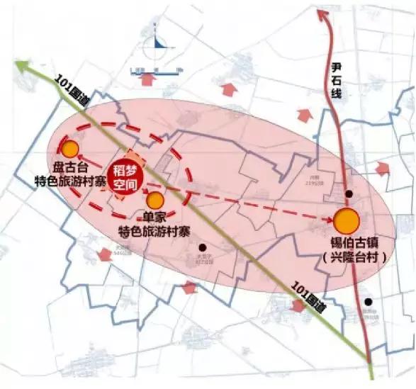 两村即单家、盘古台两个特色村寨。作为景区的延伸和扩展区域, 主动接受“稻梦空间”田园综合体的辐射, 加快宜居环境建设, 成为产业外延的主要承载区。其中:单家特色村寨充分利用地理优势, 重点打造稻米主题旅游区, 开展乡村旅游、农业观光、农事体验及文化科普等旅游活动, 重点建设稻米博物馆、温室餐饮和农业嘉年华等多种旅游项目, 提升修复基础设施。盘古台重点依托锡伯族地域文化特色, 结合村庄中部闲置地, 建设集便民服务中心、乡村养老服务和中心游园与一体的乡村公共服务中心, 利用现状村庄闲置农田和现状民宅, 重点打造创意农业旅游、锡伯民俗旅游组团以及垂钓旅游组团。