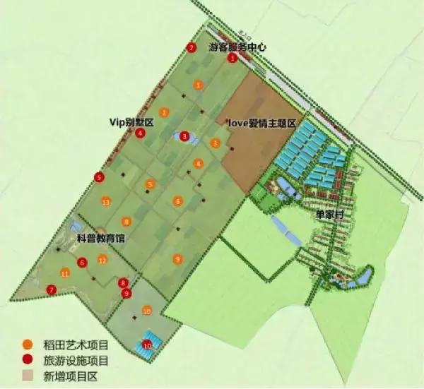 一核即打造“稻梦空间”田园综合体景观吸引核心。延伸创意农业产业内涵, 强化核心景区的环境品质与服务质量, 对现有23个项目进行改造升级, 并策划新增LOVE爱情主题区、科普教育馆等4类项目 (图3) 。